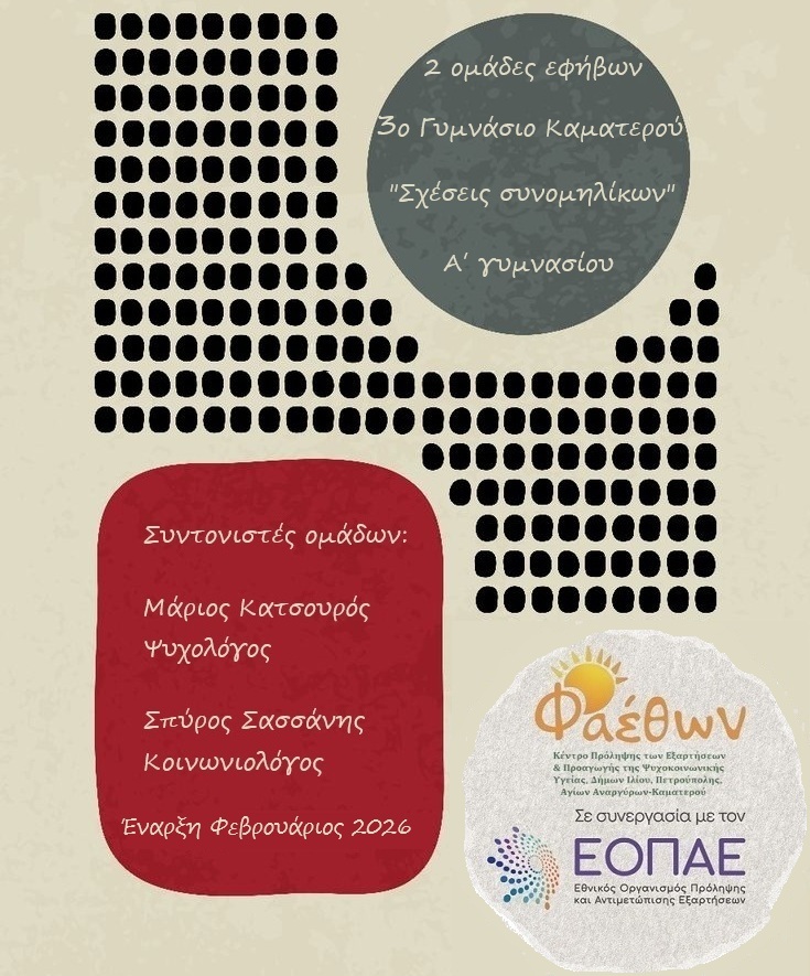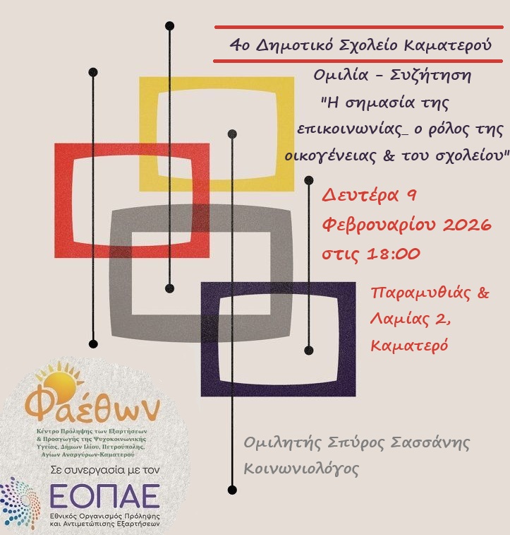 Αρχαίο ρητό, σοφό δίδαγμα, διαχρονική αξία, σημερινή ανάγκη. Ανάγκη που καθημερινά αγωνίζονται με παρρησία να καλύψουν τα στελέχη του Διαδημοτικού Κέντρου Πρόληψης των Εξαρτήσεων «Φαέθων», με βιωματικές δράσεις και διαδραστικές ομάδες στη μαθητική και την εκπαιδευτική κοινότητα αλλά και στην οικογένεια.