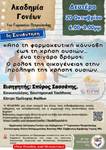 Ανακοινώσεις-Δελτία Τύπου Aκαδημία Γονέων 1ου Γυμνασίου Πετρούπολης_ 1η συνάντηση_ “Από τη φαρμακευτική κάνναβη έως τη χρήση ουσιών… ένα τσιγάρο δρόμος; Ο ρόλος της οικογένειας στην πρόληψη της χρήσης ουσιών”._ Δευτέρα 20 Οκτωβρίου 2025 Δείτε Περισσότερα»