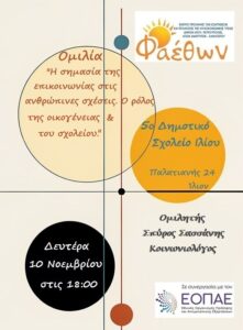 Ανακοινώσεις-Δελτία Τύπου 5ο Δημοτικό Σχολείο Ιλίου_ Ομιλία – Συζήτηση_ “Η σημασία της επικοινωνίας στις ανθρώπινες σχέσεις. Ο ρόλος της οικογένειας & του σχολείου.”_ Δευτέρα 10 Νοεμβρίου 2025, στις 18:00 Δείτε Περισσότερα»